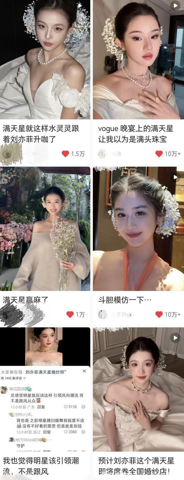 今年38岁的刘亦菲,在前几天的Vogue活动上,以一己之力继黄玫瑰后,又带火了满天星。 现在几乎众多写真拍摄店,这一造型都超级火爆。 甚至有很多网友感慨:一直以为是珍珠和细碎钻。 戴在她的头上就是高级! 这是大众对于刘亦菲的一种莫大的肯定。